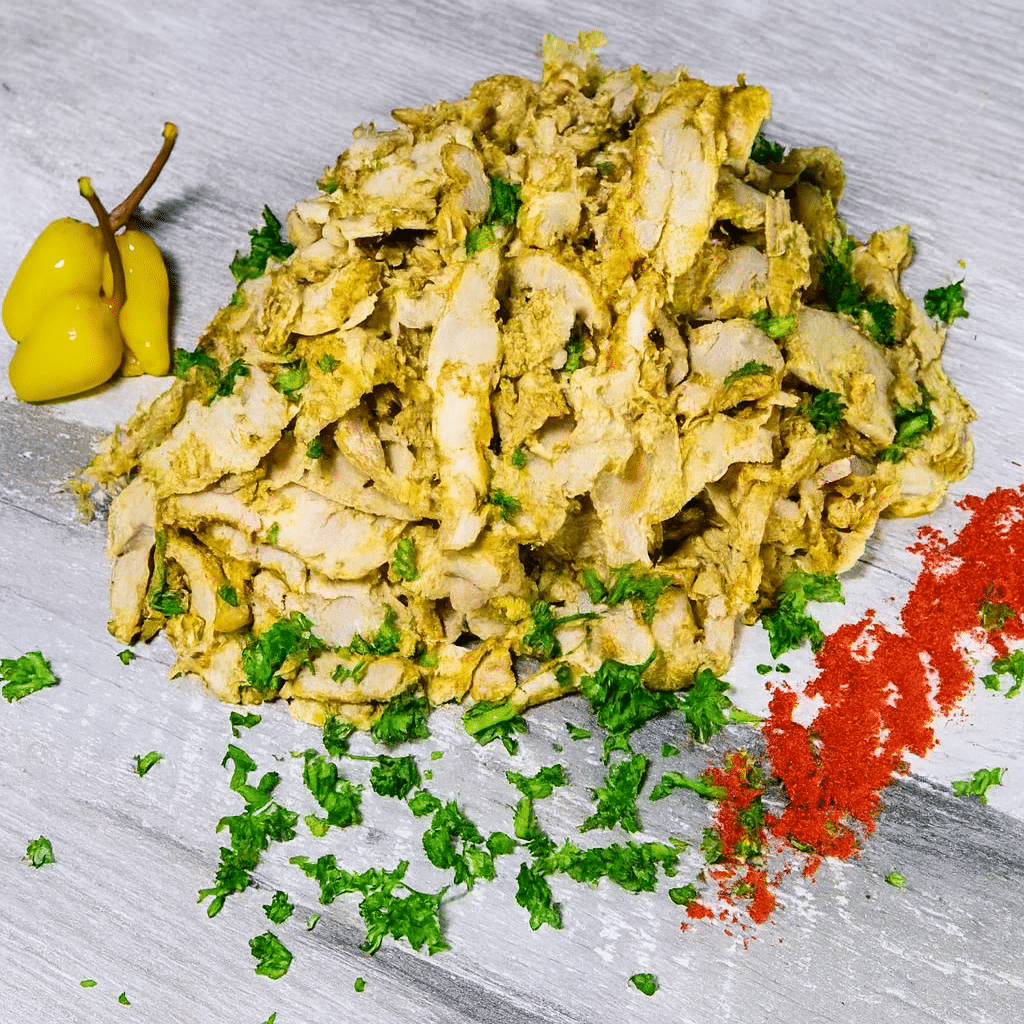 Enjoy a delicious and hearty meal with our Chicken Shawarma! Made with tender and juicy chicken thigh meat, our shawarma is slowly cooked and marinated with a special blend of spices and amba. Lamb fat and canola oil add to the rich and savory flavor, making this dish a standout in terms of taste and texture.